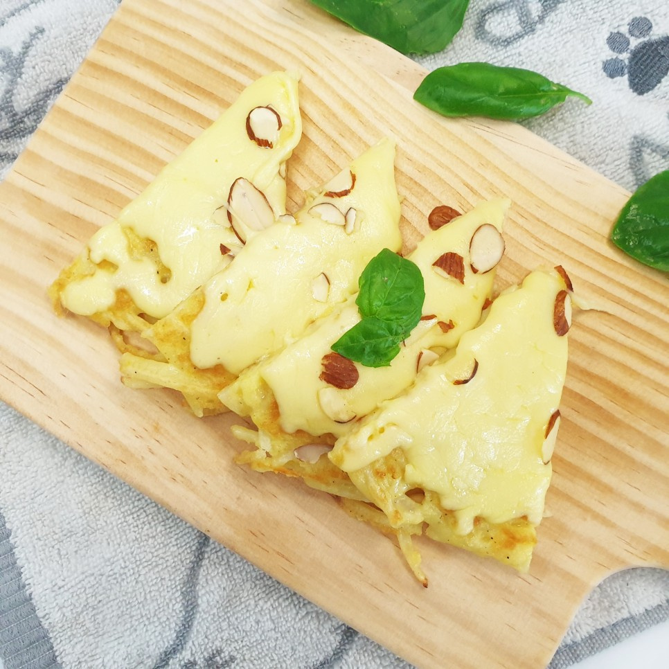 Taburkan irisan almond di atas pancake yang sudah matang untuk hiasan. Gunakan pemotong pizza atau pisau untuk memotong pancake menjadi 8 bagian yang mudah disantap. Pancake Kentang Parut Keju Anda yang lezat siap disajikan! Sangat nikmat disajikan dengan madu manis sebagai pendamping.