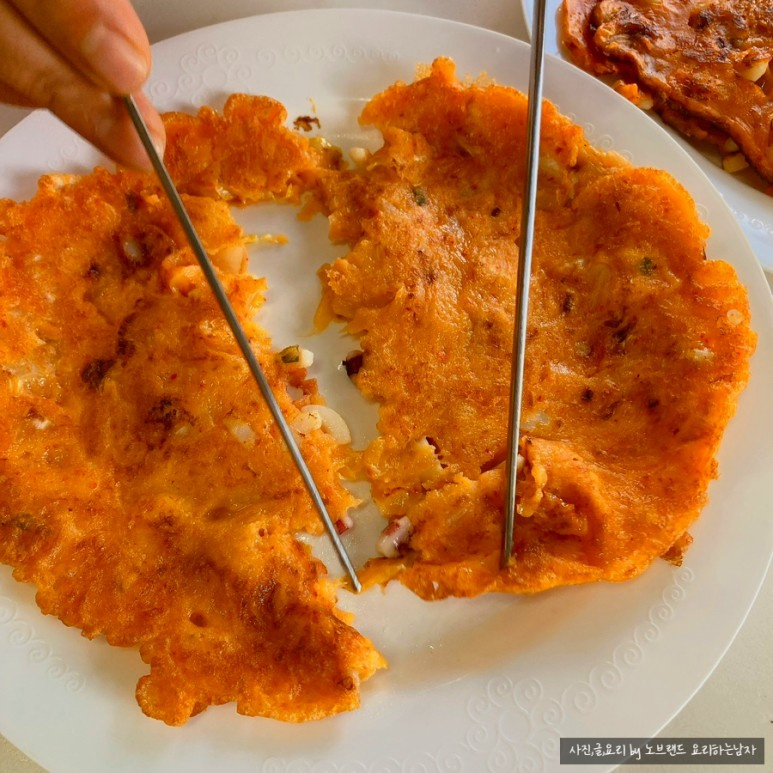 Voilà! Pancake kimchi cumi-cumi Anda yang renyah sudah siap. Cumi-cumi yang dikupas untuk kelembutan, menawarkan rasa kenyal yang menyenangkan, menyeimbangkan sempurna dengan kimchi pedas. Ini adalah hidangan pamungkas untuk hari hujan, terutama jika ditemani segelas Makgeolli yang menyegarkan. Nikmati kombinasi sempurna ini dan bersenang-senanglah!