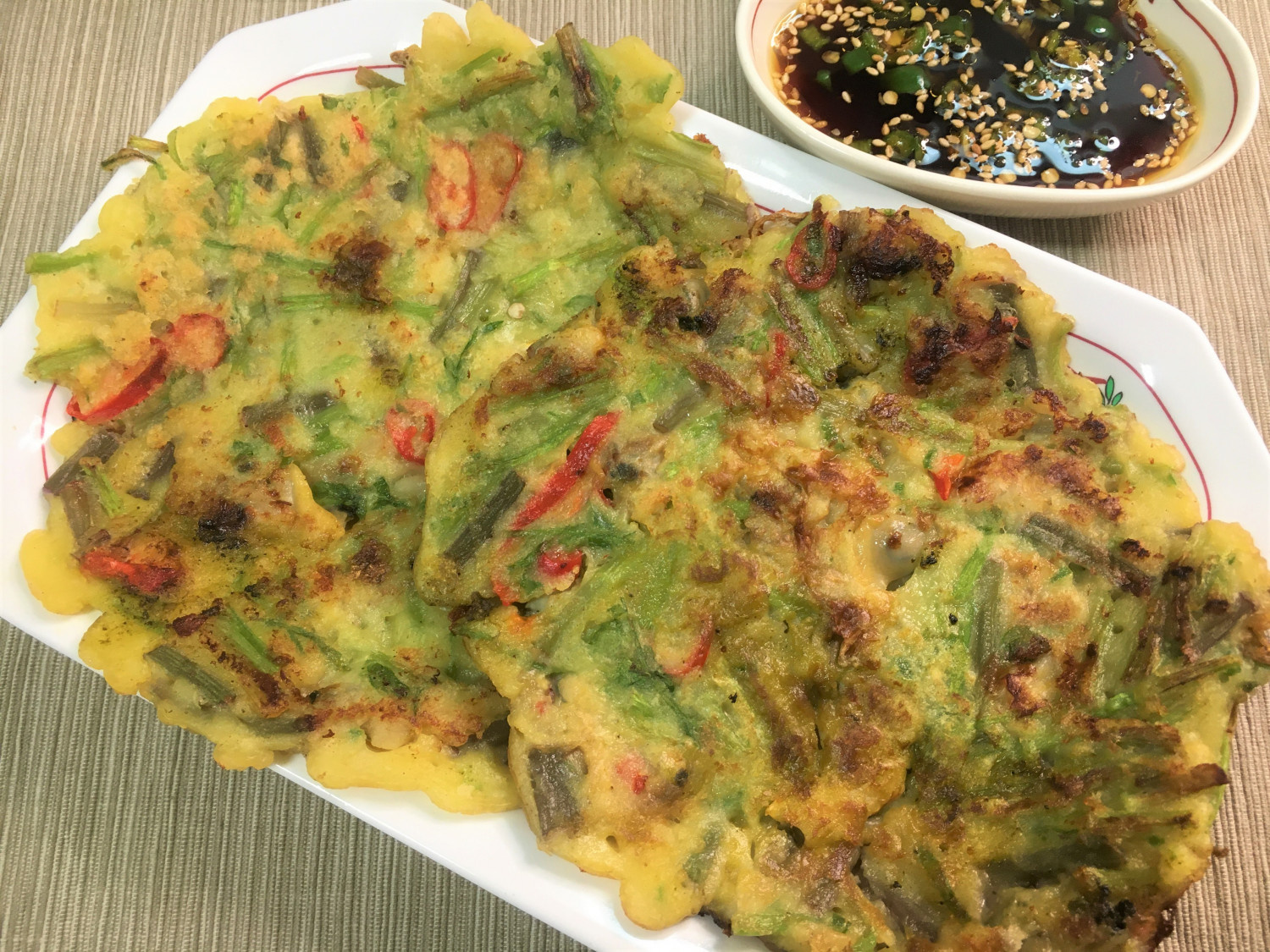 Pancake ini dipenuhi dengan minari segar (parsley air) dan daging cumi yang juicy. Dengan mencampur tepung pancake dan tepung tempura dalam rasio 1:1 dan menambahkan bahan rahasia kami, air soda, ke dalam adonan, Anda akan mencapai tekstur yang luar biasa renyah. Nikmati kerenyahan tepung tempura, kesehatan minari, dan kenyal daging cumi yang memuaskan! Tingkatkan rasanya dengan saus celup kecap manis pedas yang disajikan di samping. Ini adalah pendamping yang sempurna untuk makgeolli atau bir dingin!
