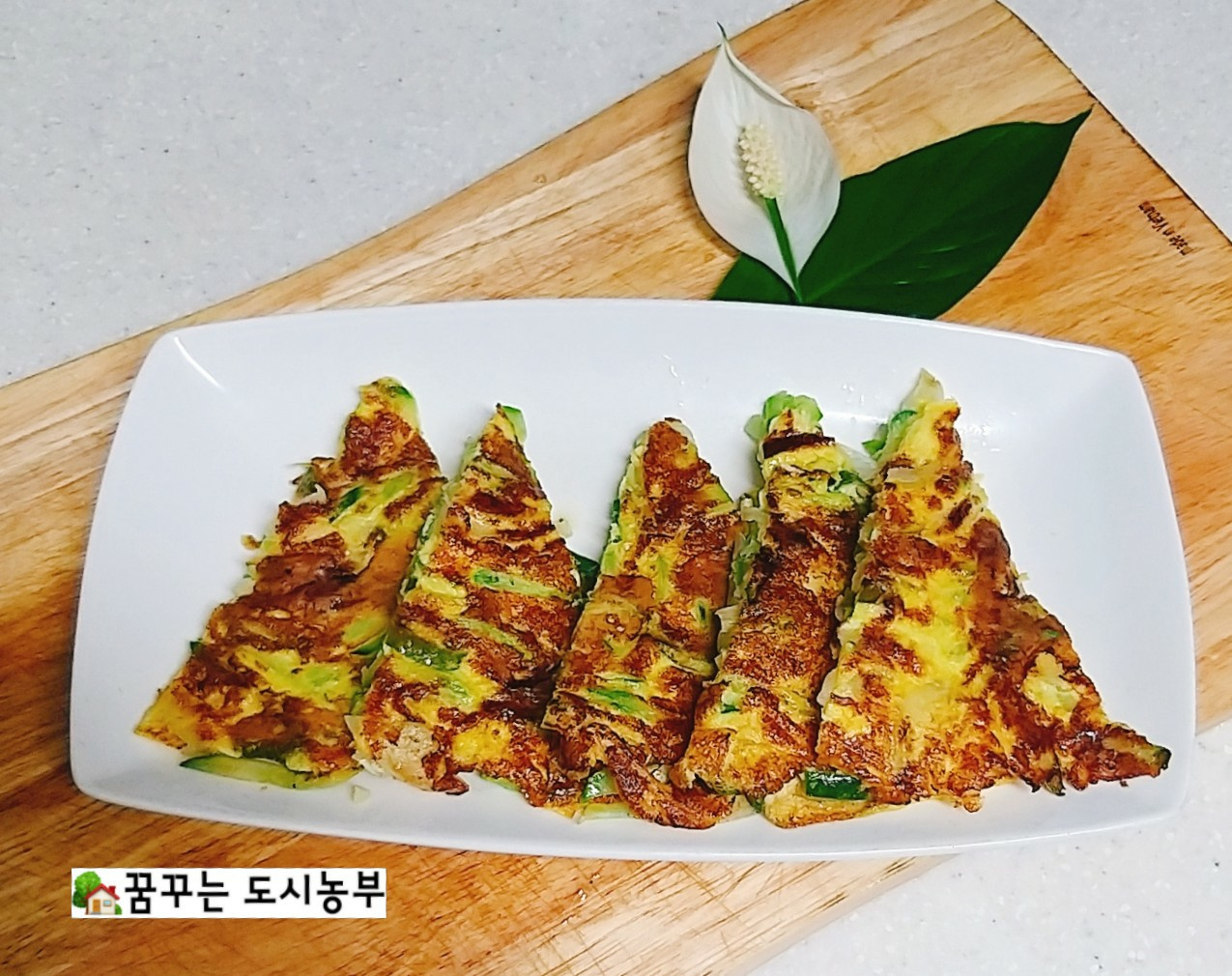 Setelah kedua sisi matang merata dan berwarna keemasan, potong pancake timun dan telur menjadi porsi seukuran gigitan (biasanya menjadi seperempat atau seperenam).