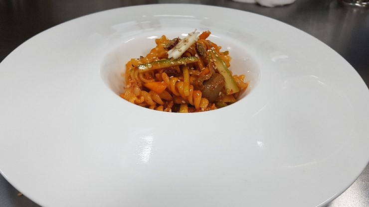 Pasta Fusilli Saus Gochujang Pedas Manis dengan Cumi dan Ginseng