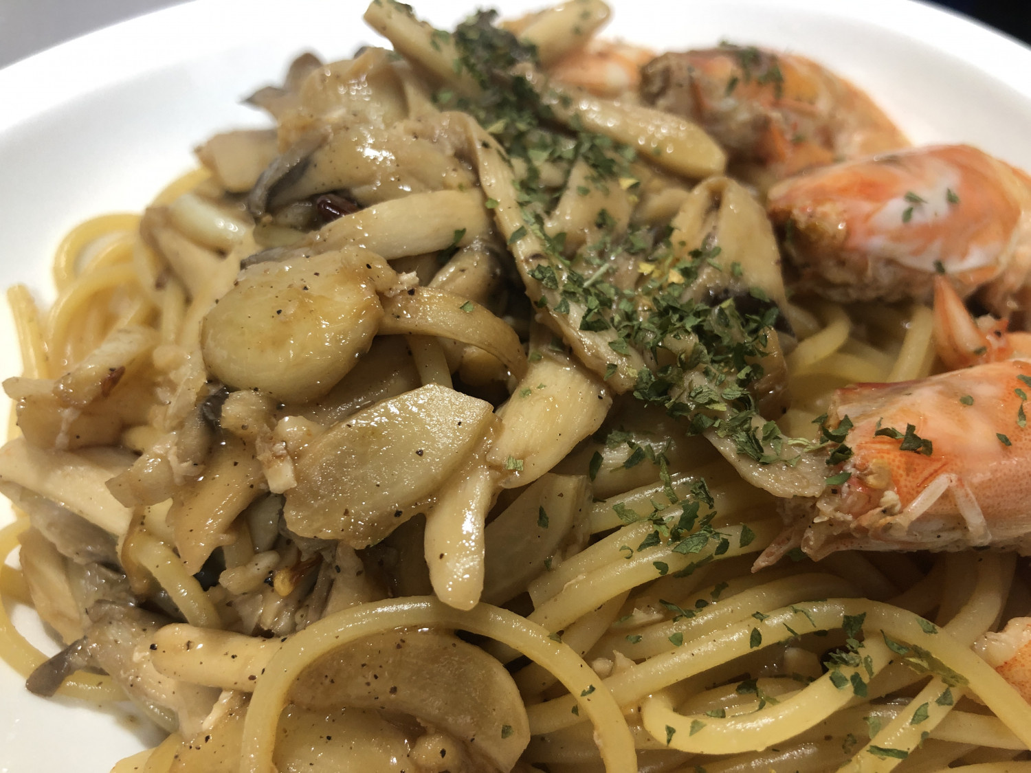 Pasta Satu Wajan dengan Jamur Tiram Raja dan Udang Musim Gugur