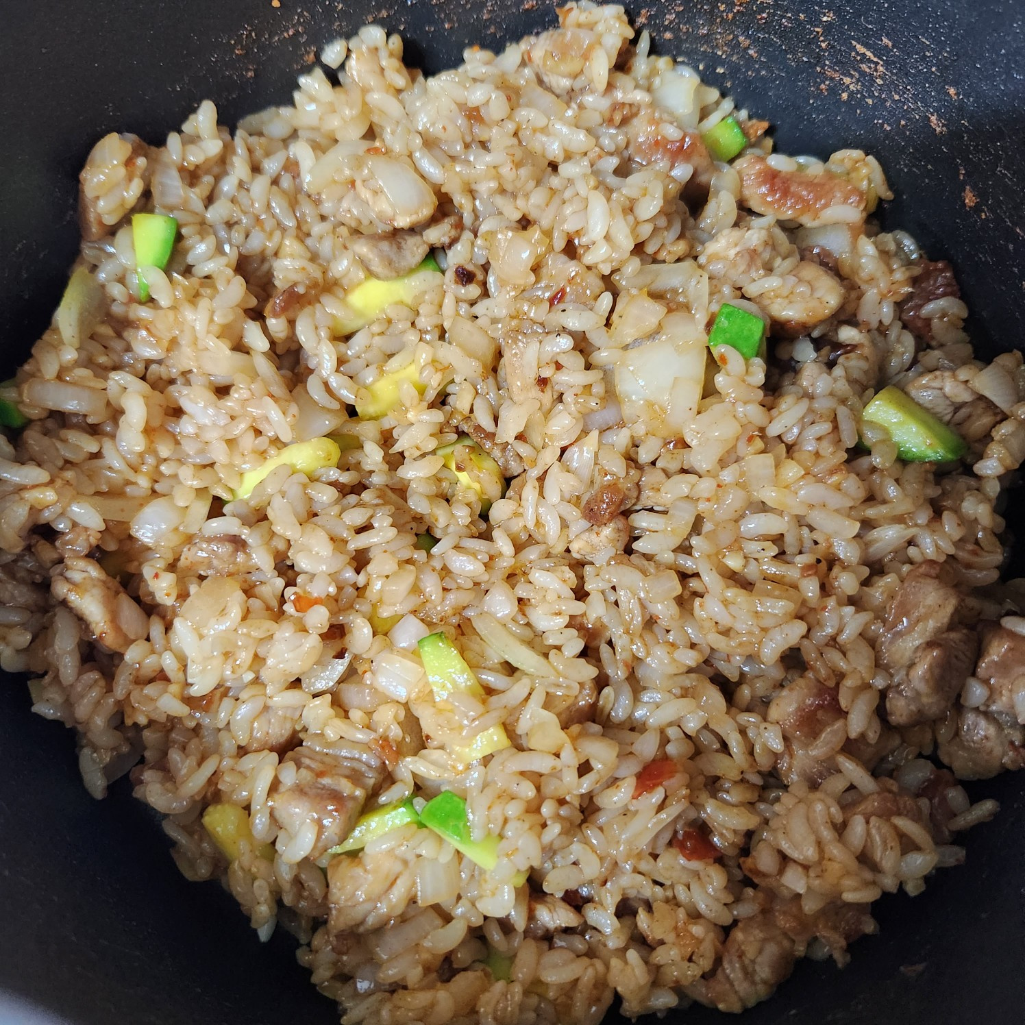 Awalnya, aduk rata bumbu dengan nasi dan babi secara kasar, pastikan tercampur merata. Jaga api tetap kecil-sedang selama tahap ini untuk mencegah saus gosong.