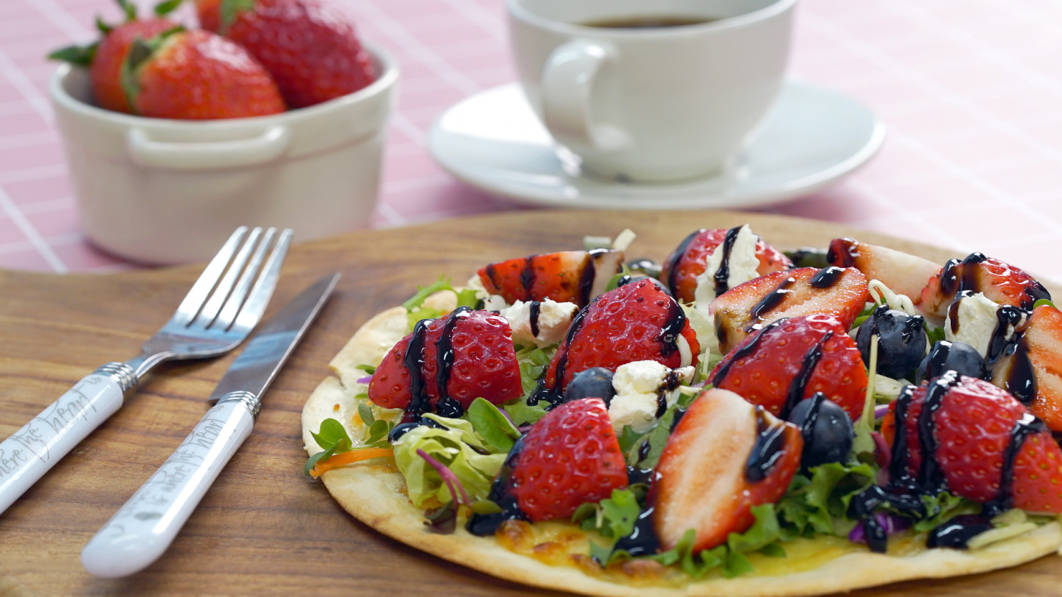Tata sayuran salad segar dengan cantik di atas keju yang meleleh dan masih hangat. Kemudian, taburkan stroberi dan bluberi yang sudah dipotong tadi dengan melimpah di atasnya. Tambahkan sesendok keju krim di beberapa bagian pizza untuk memberikan sensasi rasa creamy yang lezat. Terakhir, siramkan glazur balsamik sesuai selera untuk memberikan sentuhan rasa manis dan asam yang melengkapi keseluruhan rasa. Pizza stroberi lezatmu kini siap dinikmati! Paling nikmat disantap selagi hangat.