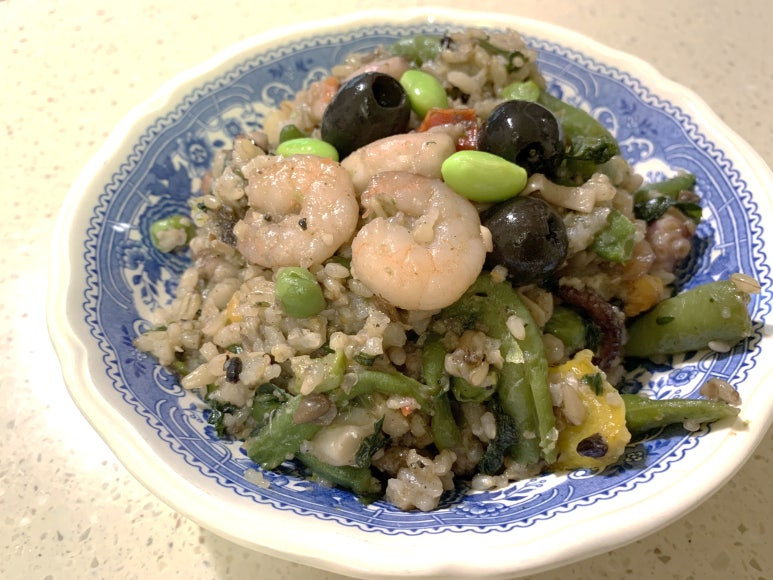 Poke Udang & Sayuran Anda kini selesai! Hiasi dengan kacang kedelai rebus dan zaitun hitam. Meskipun secara tradisional poke melibatkan persiapan komponen secara terpisah dan kemudian merakitnya, metode satu wajan ini menghasilkan hidangan yang pada dasarnya adalah nasi goreng yang lezat. Ini adalah makanan yang memuaskan dan beraroma yang sangat sederhana untuk dibuat, menawarkan alternatif yang bagus untuk persiapan yang lebih memakan waktu.
