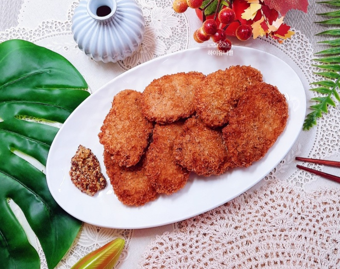 Putri saya yang berusia 7 tahun sangat menyukai tonkatsu, jadi saya sering membuatnya. Tonkatsu buatan sendiri terasa jauh lebih enak daripada yang beku, jadi saya jarang membelinya. Putri saya juga lebih memilih tonkatsu buatan ibu daripada yang beku. Hari ini, seperti biasa, saya membuat potongan mini tonkatsu menggunakan daging tenderloin sapi yang lembut. Daging tenderloin sapi memiliki bentuk bulat alami, yang membuatnya sempurna untuk membuat potongan mini tonkatsu yang menggemaskan ini. Rasa tonkatsu yang baru digoreng sangat gurih dan lezat! Melihat putri saya dengan gembira mengunyahnya selalu mencerahkan hari saya.