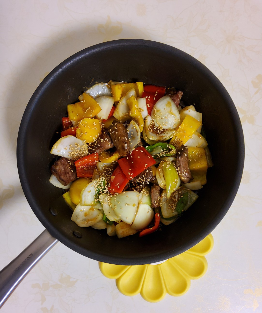 Masukkan sayuran yang sudah disiapkan ke wajan yang sama dan tumis hingga mulai sedikit transparan. Sekarang, kembalikan daging sapi yang sudah dipanggang ke wajan. Tuangkan semua saus khas yang sudah disiapkan. Tingkatkan api menjadi sedang-tinggi dan tumis semuanya dengan cepat selama sekitar 1-2 menit, pastikan semua bahan terlapisi saus secara merata.