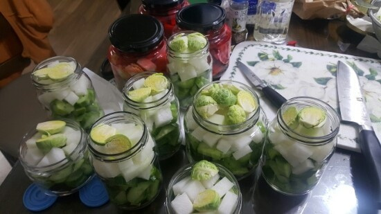 Isi toples kaca yang sudah disterilkan dengan lobak daikon dan mentimun yang sudah disiapkan, padatkan. Mengisi toples dengan rapat penting agar bahan-bahan terendam saat Anda menuangkan cairan acar panas, sehingga tidak mengapung.