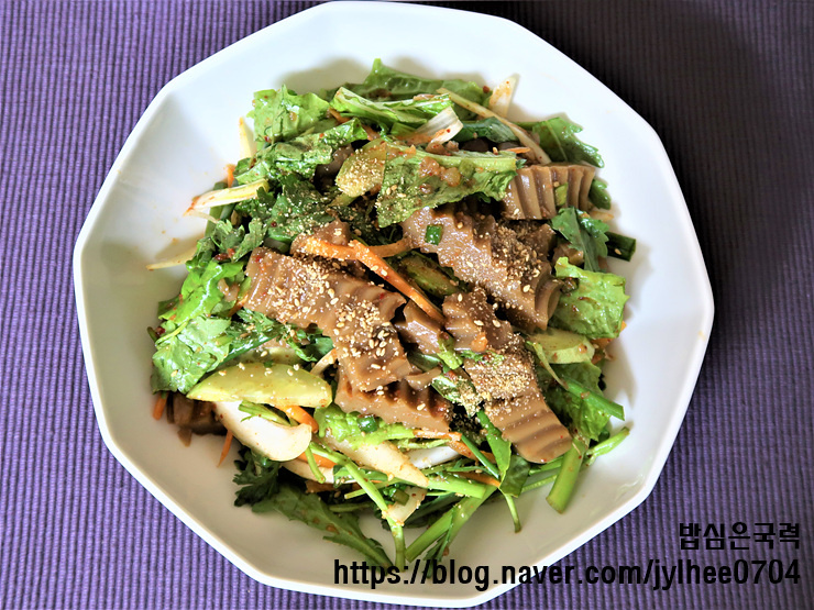 Rahasia utama untuk acar jeli biji pohon ek yang beraroma adalah bumbu yang tepat! Lumuri jeli biji pohon ek yang telah dipotong dengan lembut menggunakan 3 sejumput garam, 1 sdm minyak perilla, dan 1 sdm cuka. Aroma kacang dari minyak perilla dan rasa asam dari cuka akan meresap secara halus ke dalam jeli, memberikannya rasa yang lebih kaya dan tekstur yang lebih kokoh. Menambahkan cuka terlebih dahulu membantu mencegah sayuran menjadi terlalu lembek saat dicampur nanti.