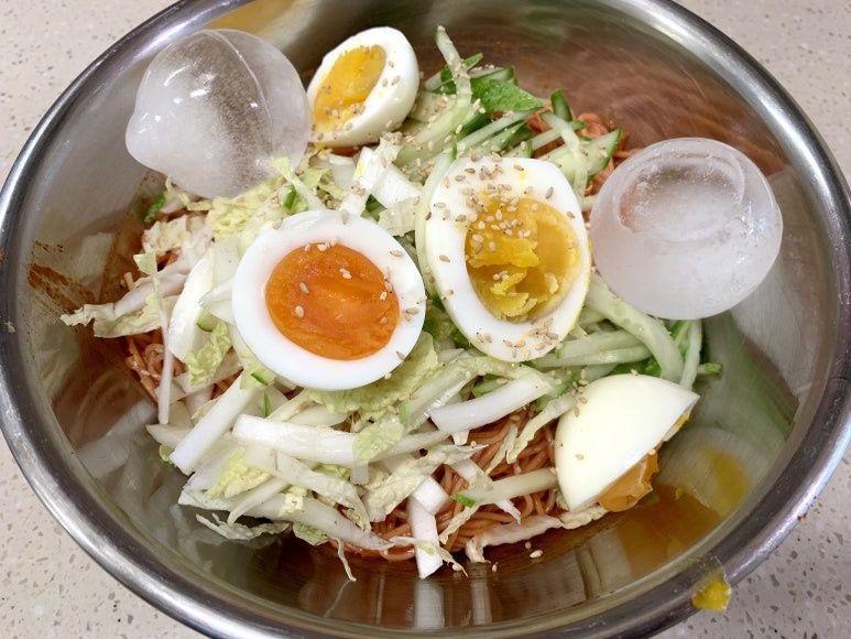 Saya berencana membuat jeon (panekuk Korea), tetapi kemudian terpikirkan bahwa bibim guksu (mi campur) yang pedas dan asam akan lebih cocok dengan mi daripada nasi. Jadi, inilah resep bibim guksu gochujang yang super sederhana! Anda bisa membuatnya dengan mudah menggunakan bahan-bahan dasar yang kemungkinan ada di rumah. Jangan ragu untuk menggunakan sisa sayuran di kulkas Anda! Saya menggunakan kol napa dan mentimun, dan tentu saja, telur rebus setengah matang adalah suatu keharusan untuk bibim guksu. Mari kita buat bibim guksu yang cepat dan mudah ini yang berpadu indah dengan jeon kita?