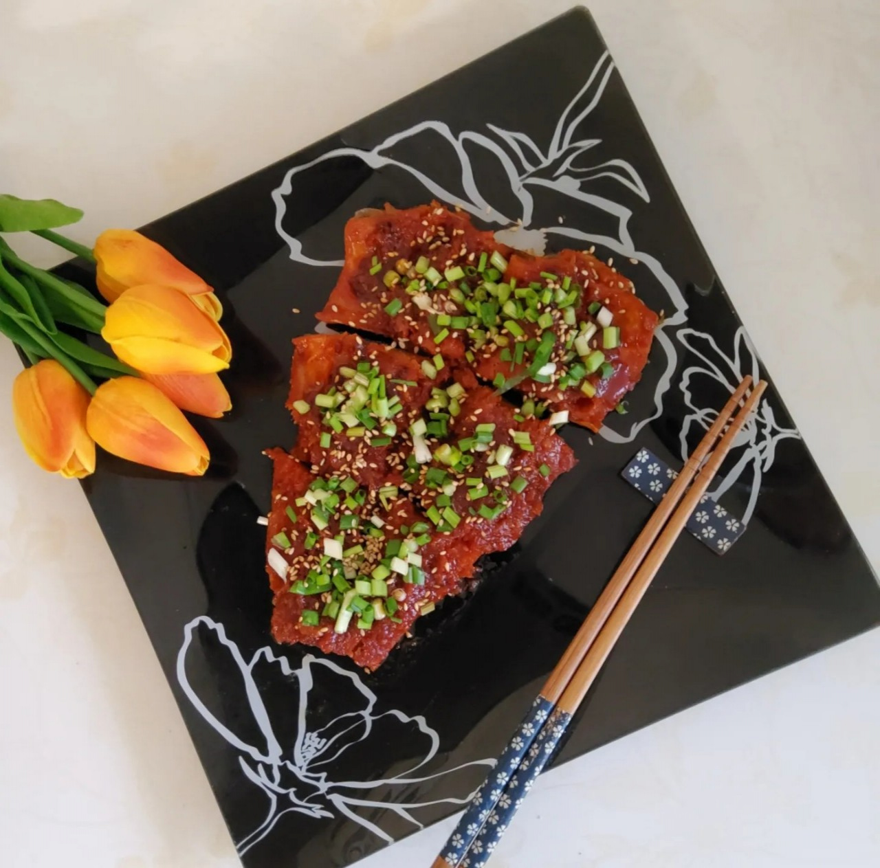 Langkah terakhir adalah penyajian! Tata Hwangtae Gui yang sudah dipanggang dengan sempurna secara menarik di atas piring. Taburkan irisan daun bawang halus di atasnya sebagai hiasan segar. Akhiri dengan taburan biji wijen untuk menambah rasa gurih dan daya tarik visual.