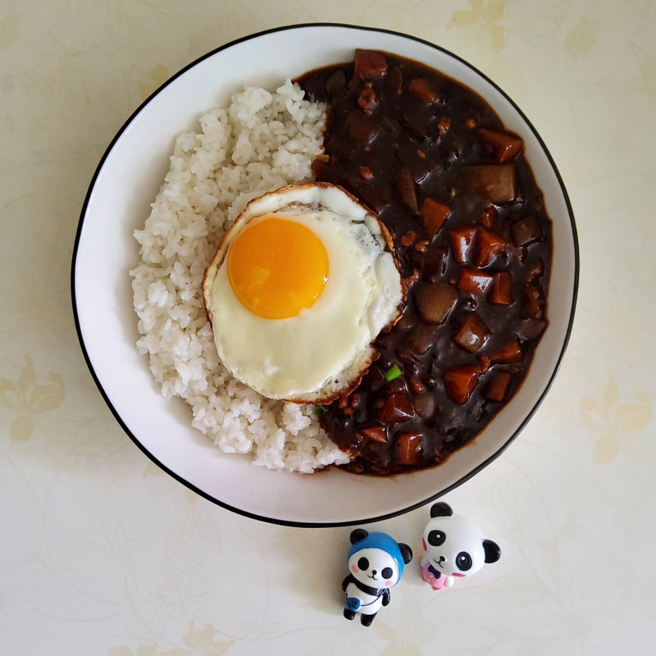 Saatnya menyusun Jjajangbap Anda! Isi mangkuk dengan nasi hangat Anda yang pulen. Siramkan saus Jjajang lezat yang baru dibuat dengan melimpah di atas nasi. Hiasi dengan telur mata sapi yang matang sempurna untuk sentuhan ekstra kenikmatan! Jika suka, taburkan daun bawang cincang di atasnya sebagai garnitur.