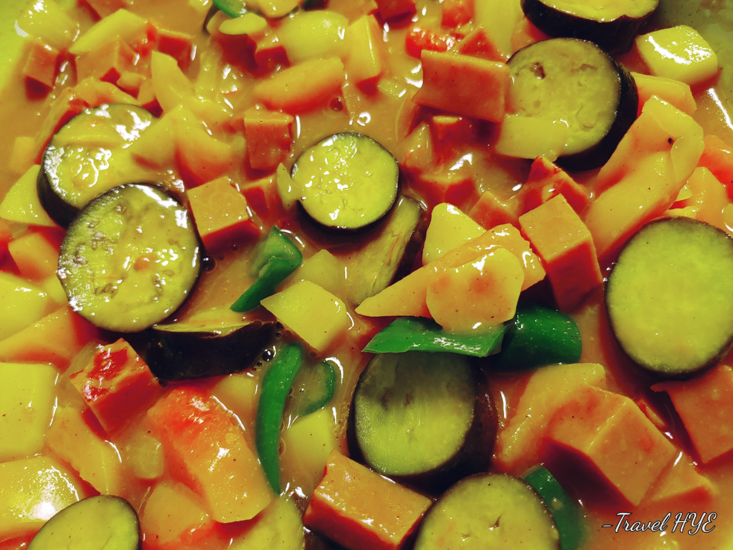 Terakhir, masukkan irisan terong dan cabai hijau Korea, lalu aduk perlahan. Untuk menjaga tekstur renyah yang menyenangkan, masak hanya sekitar 30 detik setelah menambahkan sayuran ini. Jika Anda lebih suka tekstur yang lebih lembut, Anda bisa menambahkan terong dan cabai sebelum memasukkan bubuk kari dan memasaknya sedikit terlebih dahulu. Setelah semua bahan matang sempurna, Kari Labu Madu, Ham, dan Sayuran Anda yang lezat siap disajikan!