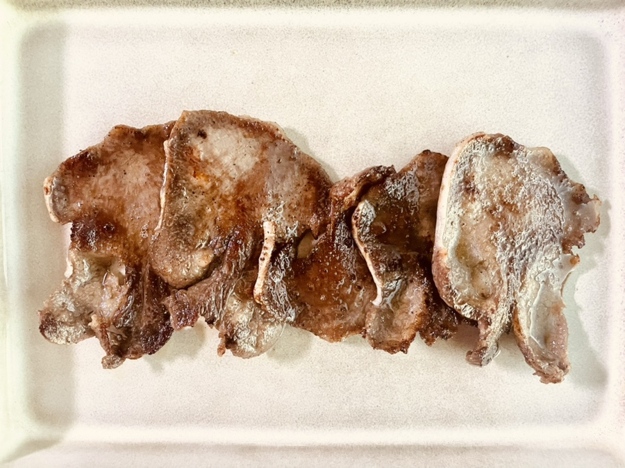 Setelah lidah sapi setengah beku, keluarkan dan iris tipis, usahakan ketebalan sekitar 1-2mm. Mengiris tipis sangat penting untuk mendapatkan tekstur yang lembut saat dipanggang.