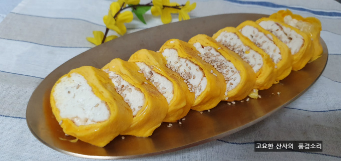 Siapkan wajan untuk membuat omelet. Tambahkan minyak goreng secukupnya ke wajan dan panaskan dengan api kecil. Pertama, tuang campuran putih telur dan tahu tipis-tipis ke wajan untuk dimasak seperti telur dadar datar (jidan). Setelah satu sisi matang, balik dan masak sedikit lagi. Kemudian, geser lapisan yang matang ini ke satu sisi wajan. Sekarang, tuangkan campuran kuning telur yang sudah dibumbui ke ruang kosong dan ratakan tipis untuk dimasak. Saat telur dadar kuning telur mulai matang, letakkan lapisan putih telur dan tahu yang sudah dimasak sebelumnya dengan hati-hati di atasnya. Ulangi proses ini 2-3 kali, bergantian melapisi campuran putih telur/tahu dan campuran kuning telur. Teknik pelapisan ini menciptakan warna yang indah. Untuk lapisan terakhir, tuangkan sisa adonan telur yang ada di atas seluruh gulungan untuk menutupinya.