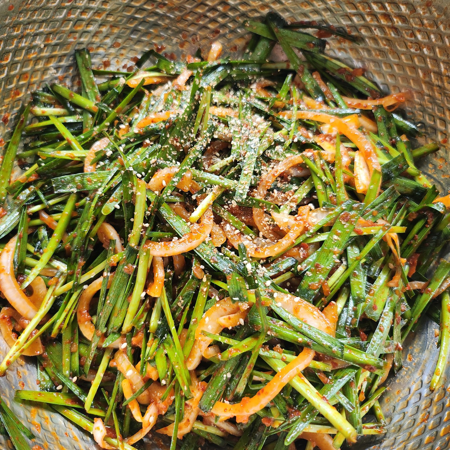 Aduk perlahan dengan tangan agar bumbu tercampur rata. Hindari mengaduk terlalu kuat karena bisa membuat kucai menjadi lembek. Kuncinya adalah mengaduk dengan lembut! Anda bisa menikmatinya segera, atau menyimpannya di lemari es sebentar agar bumbu meresap dan rasanya lebih kaya. Oseng kucai lezat Anda siap dinikmati!