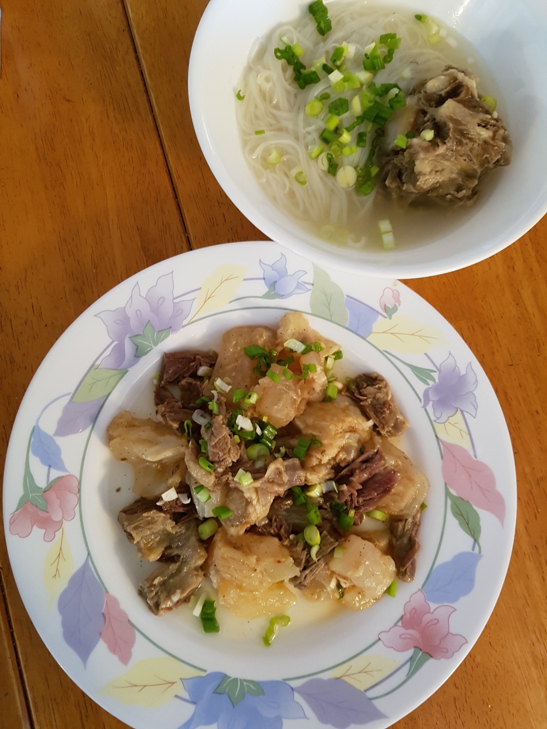 Setelah empuk setelah 3 jam, angkat ceker sapi dan ekor sapi dari panci, biarkan sedikit mendingin, lalu potong-potong sesuai selera. Pisahkan daging dari tulang ekor sapi, dan potong ceker sapi menjadi bagian yang mudah dimakan. Iris tipis daun bawang untuk hiasan.