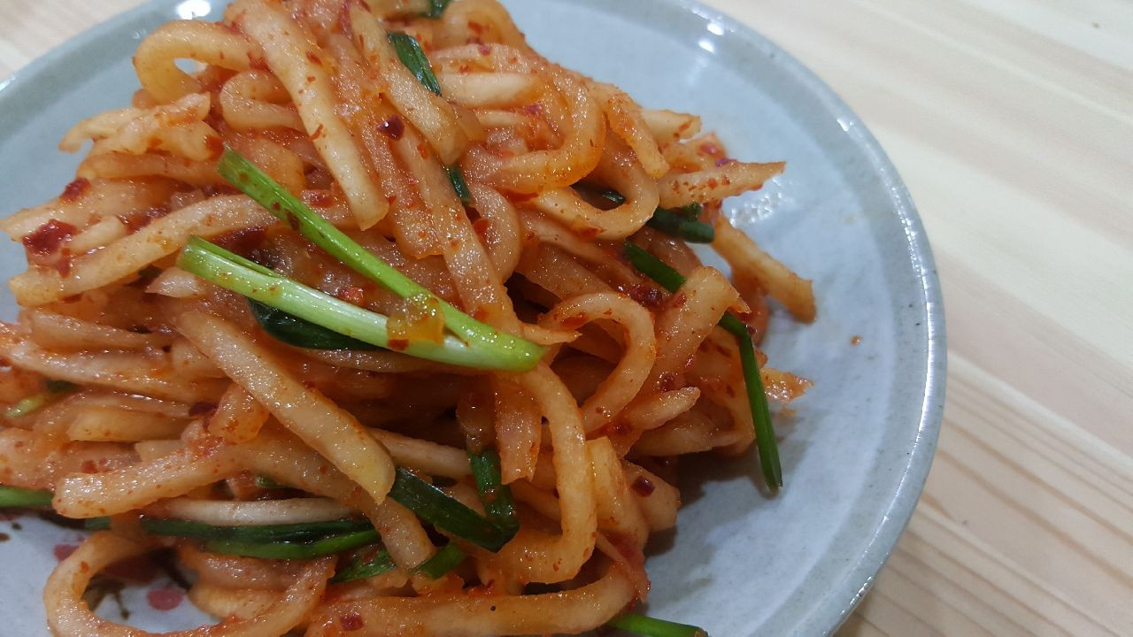 Mu Saengchae yang diaduk dengan tangan terlihat sangat menggugah selera! Warnanya cerah dan indah, dan teksturnya yang renyah dari baru dicampur terjaga dengan sempurna.