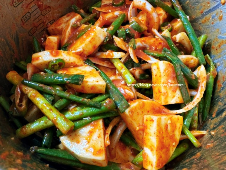 Jika Anda memiliki sisa bumbu dari pembuatan kimchi daun bawang, Anda bisa menggunakannya untuk membuat seokbakji yang lebih praktis dan lezat. (Sekitar 1 cangkir).