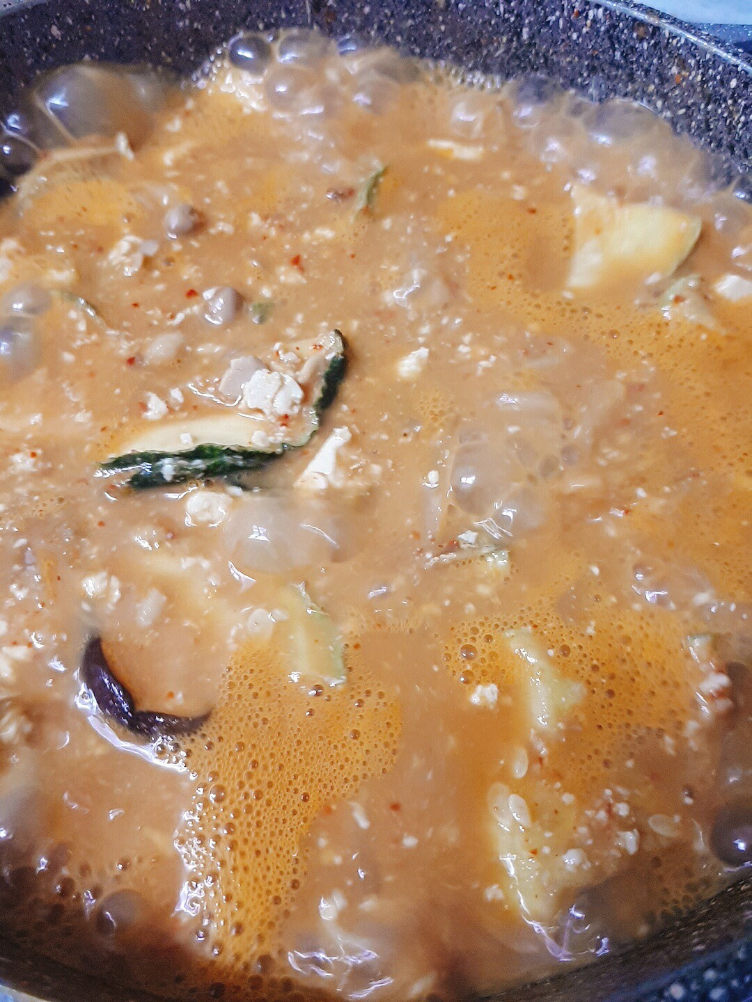 Sekarang, tambahkan bahan utamanya, Cheonggukjang, dan aduk hingga larut sepenuhnya tanpa gumpalan. Berhati-hatilah agar tidak memasak Cheonggukjang terlalu lama, karena dapat menghilangkan aroma gurihnya dan menjadi pahit. Rebus sebentar hanya sekitar 5-7 menit setelah ditambahkan. (Tips: Menggunakan Cheonggukjang beku dapat membantu mempertahankan rasa segarnya.)