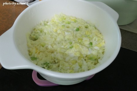 Cincang halus 1/2 bawang bombay dan sedikit zukini. Anda juga bisa memotongnya memanjang (julienne), tetapi mencincangnya akan membuatnya tercampur lebih merata ke dalam adonan telur untuk tekstur yang lebih lembut.