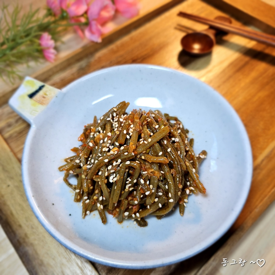 Sekarang saatnya membumbui. Dalam wajan cekung atau panci lebar, masukkan semua batang ubi jalar yang sudah disiapkan. Tambahkan 1 sendok makan bawang putih cincang, 2 sendok makan cabai bubuk, 1 sendok makan kecap asin khas Korea, 1 sendok makan kecap ikan, 1 sendok makan anggur beras, 1/2 sendok makan ekstrak plum, dan 1 sendok makan minyak perilla yang harum. Campurkan semuanya, siap untuk dimarinasi.