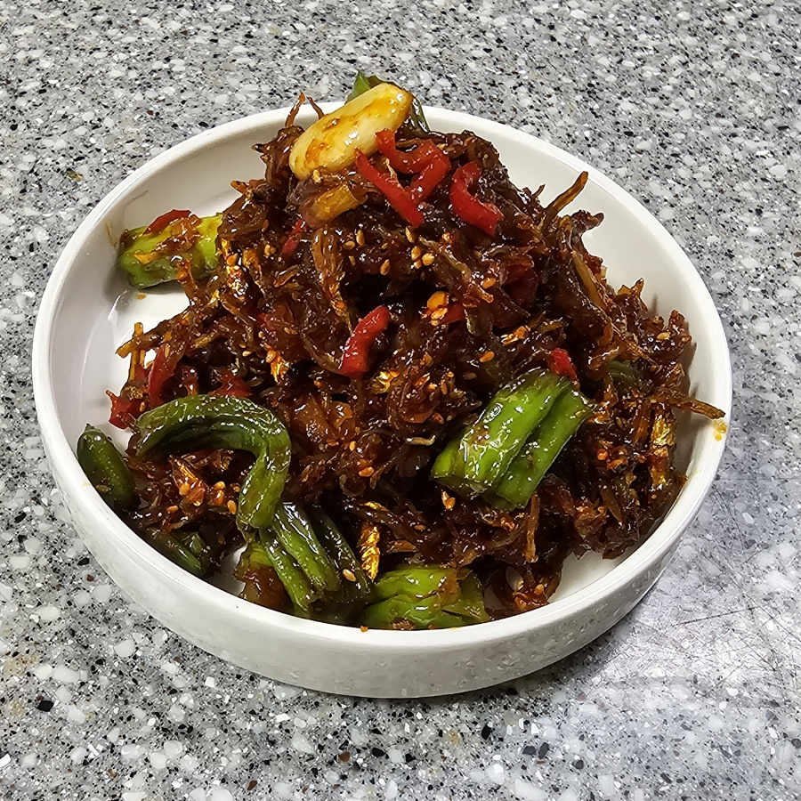 Ikan teri yang ditumis dengan saus gochujang pedas manis menawarkan rasa kaya yang memenuhi mulut Anda, membuat Anda ingin makan nasi. Sangat lezat disajikan di atas nasi hangat!