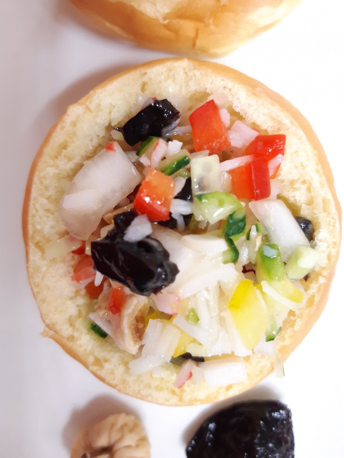 Dalam mangkuk, campurkan roti yang sudah dikosongkan dengan sayuran cincang yang telah disiapkan (mentimun, bawang bombay, paprika), stik kepiting, dan buah-buahan kering (tin kering, plum kering). Taburkan 10g bubuk yogurt secara merata di atas semua bahan.