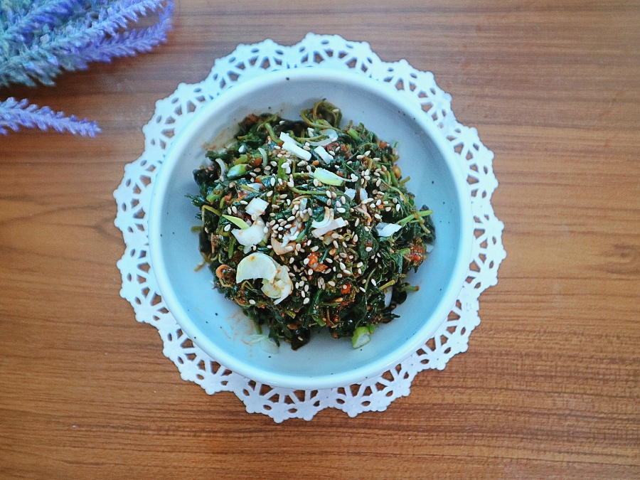 Tambahkan amaranth yang sudah ditiriskan dengan baik dan daun bawang cincang ke dalam saus yang sudah disiapkan. Aduk perlahan dan campur dengan tangan Anda hingga semuanya terlapisi merata. Amaranth bisa dibumbui dengan sederhana menggunakan kecap asin untuk rasa yang bersih dan ringan, tetapi membumbui dengan pasta kedelai (doenjang) atau gochujang akan menambah rasa yang lebih dalam dan kaya. Hari ini, kita membuat salad amaranth berbasis gochujang, menonjolkan rasa umami yang mendalam. Salad amaranth adalah lauk yang sangat cocok untuk melengkapi makanan apa pun!