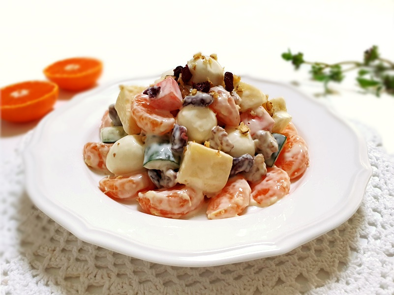 Pertama, siapkan buah-buahan dan sayuran untuk salad. Buang biji apel dan potong dadu seukuran sekali gigit. Kupas jeruk mandarin dan pisahkan per bagian. Cuci timun, potong kedua ujungnya, buang bijinya, dan potong dadu. Cuci dan kupas wortel, lalu potong dadu kecil. Rebus telur puyuh, kupas kulitnya, dan sisihkan.