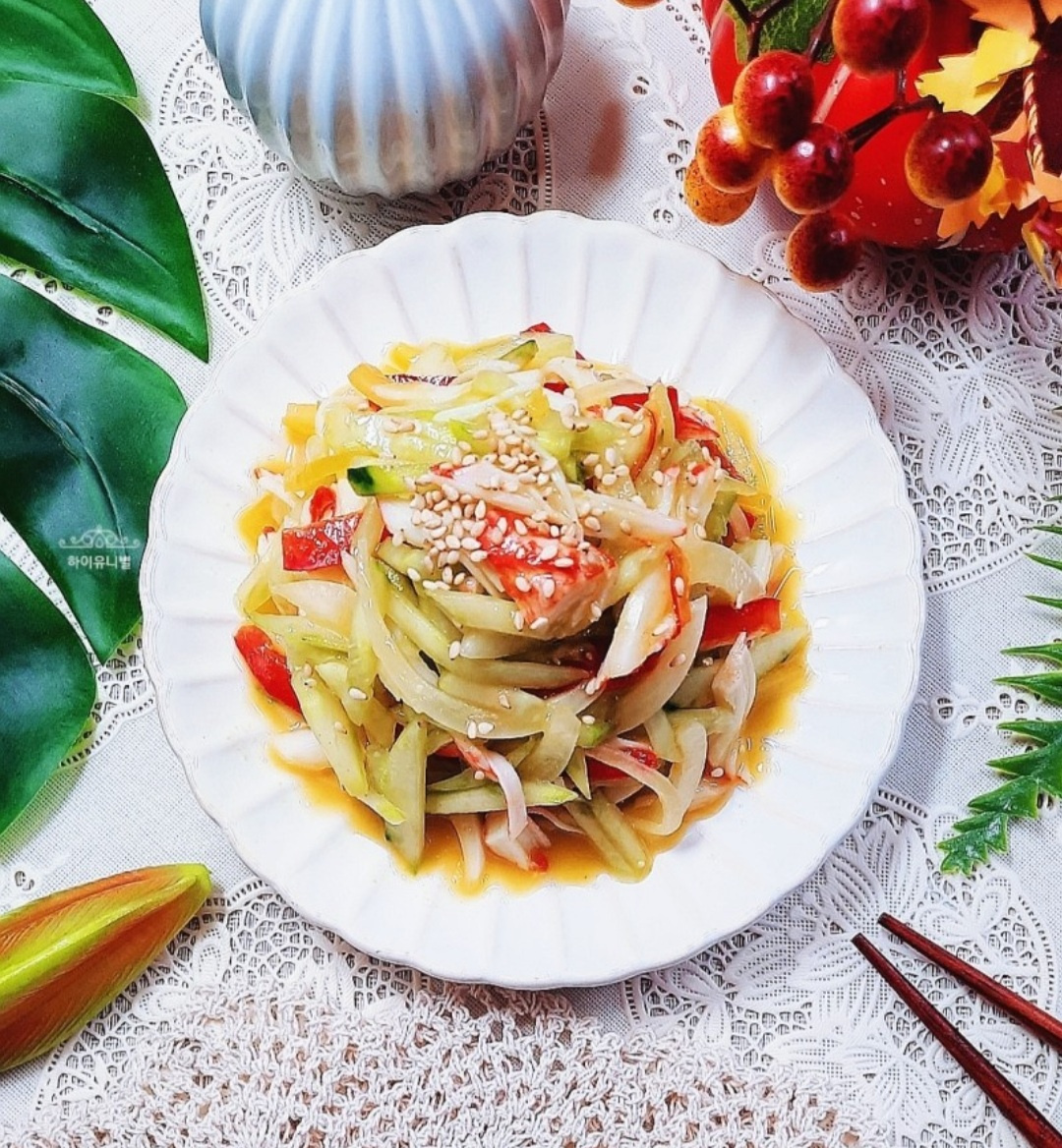 Inilah dia – Salad Dingin Stik Kepiting yang lezat, menampilkan timun renyah, aneka sayuran berwarna-warni, dan stik kepiting yang lembut, semuanya terlapisi dengan indah dalam saus mustard yang tajam! Rasa timun yang menyegarkan dan dingin dikombinasikan dengan manis gurihnya stik kepiting imitasi menciptakan sensasi yang menyenangkan di mulut Anda. Tekstur renyah dari berbagai sayuran menambahkan dimensi yang indah pada hidangan. Saus mustard yang sedikit pedas membersihkan langit-langit mulut, membuatnya sempurna untuk memulai makan atau dinikmati sepanjang waktu. Salad dingin yang lezat ini ideal sebagai camilan ringan atau hidangan utama yang memuaskan. Pastikan untuk menambahkan hidangan yang bersemangat ini ke meja Anda!
