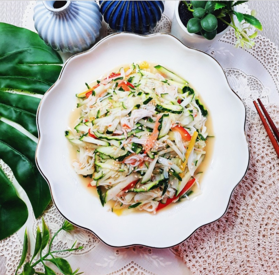 Hari ini, kami telah menyiapkan salad dingin yang lezat dan sedikit pedas menggunakan stik kepiting dan timun yang renyah. Sensasi pedas khas dari saus mustard sungguh memikat, bukan? Kombinasi timun segar yang renyah dan stik kepiting yang gurih menciptakan harmoni yang sempurna di lidah. Ini adalah hidangan ideal untuk membangkitkan selera makan Anda di hari-hari yang lebih hangat.
