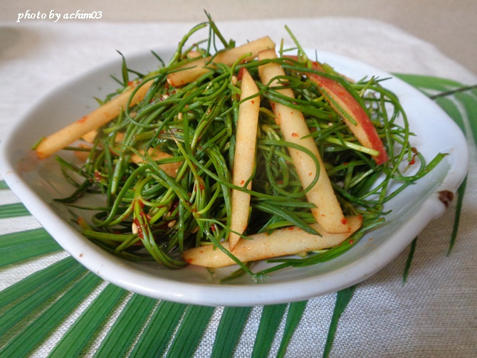 Purslane laut, yang juga dikenal sebagai ‘갯나물’ (Gaetnamul), sayuran laut yang lembut, bertemu dengan apel renyah dalam salad yang menyenangkan ini. Rasakan perpaduan menarik antara rasa manis, asam, dan tekstur renyah yang menjadikan Salad Purslane Laut dan Apel ini hidangan kuliner yang unik.