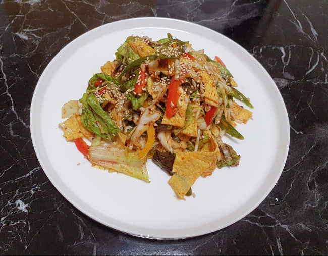 Salad gaya Korea yang menyegarkan ini, yang disebut ‘Geotjeori’, menggabungkan kesegaran daun selada dengan kelezatan telur dadar yang diiris tipis. Diperkaya dengan bumbu sederhana yang menonjolkan rasa alami sayuran, hidangan ini adalah hidangan pembuka atau pendamping yang lezat untuk menggugah selera.