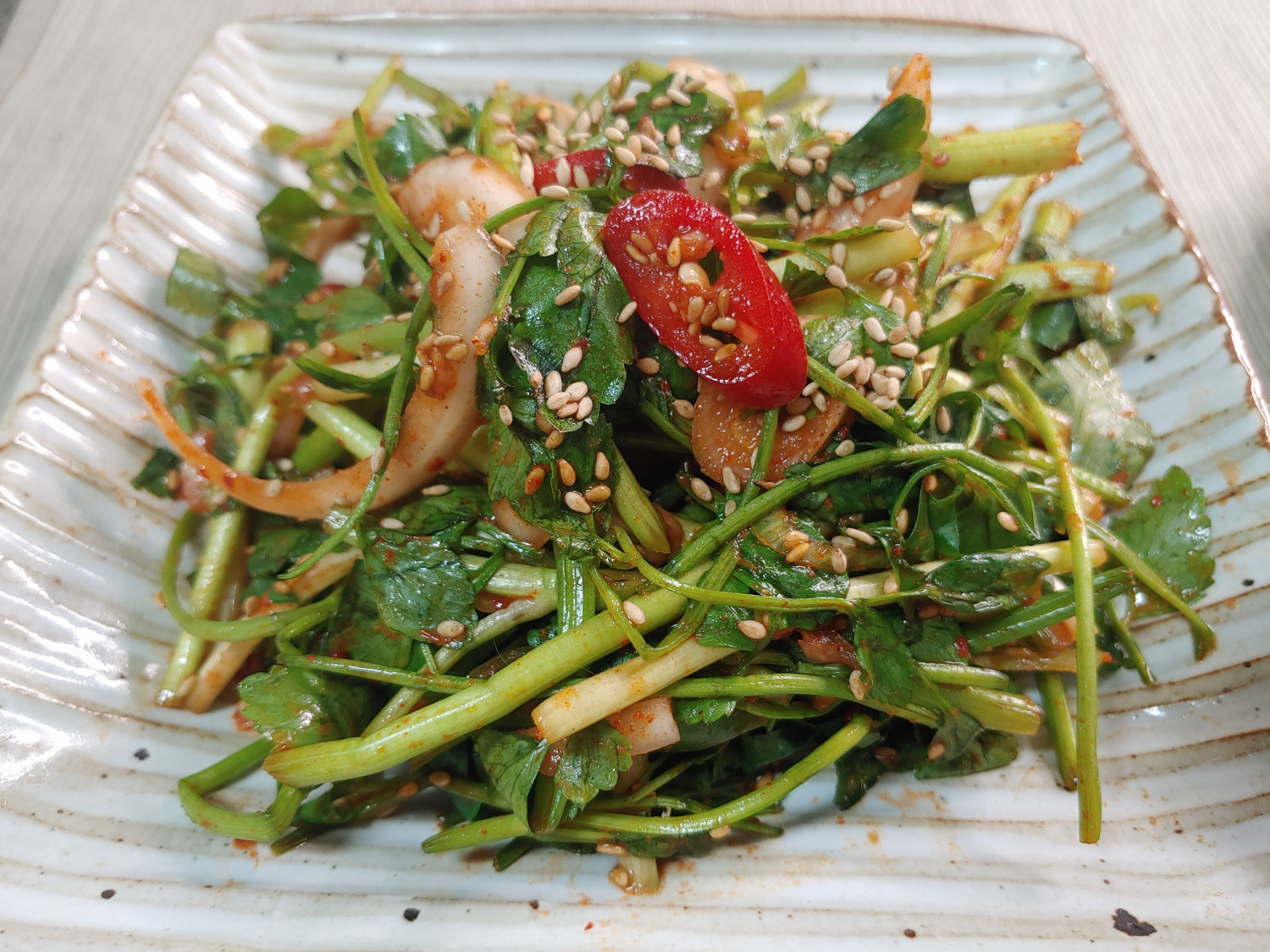 Seledri air yang dipanen di musim semi sangat lembut dan harum. Resep ini menggabungkannya dengan saus manis dan asam yang sempurna untuk merangsang nafsu makan dan meningkatkan kesehatan. Saus, yang berbasis gochujang (pasta cabai Korea) dan cuka, meningkatkan rasa segar seledri air, menjadikannya hidangan lezat untuk dinikmati, terutama ketika Anda membutuhkan dorongan energi. Salad seledri air ini sangat baik untuk detoksifikasi dan mengatasi kelelahan musim semi.