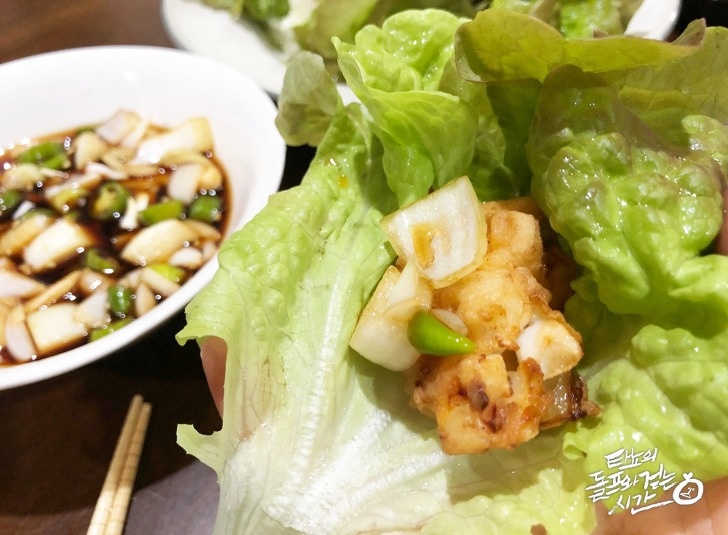 Saatnya menikmati! Ambil selembar daun selada segar, letakkan satu gorengan renyah di atasnya, dan tambahkan sedikit bawang bombay dan cabai acar dari saus kecap. Bungkus semuanya dan gigit besar! Ledakan rasa dan tekstur sungguh luar biasa. Ini benar-benar menyoroti lanskap kuliner Jeolla yang luar biasa dan beragam.