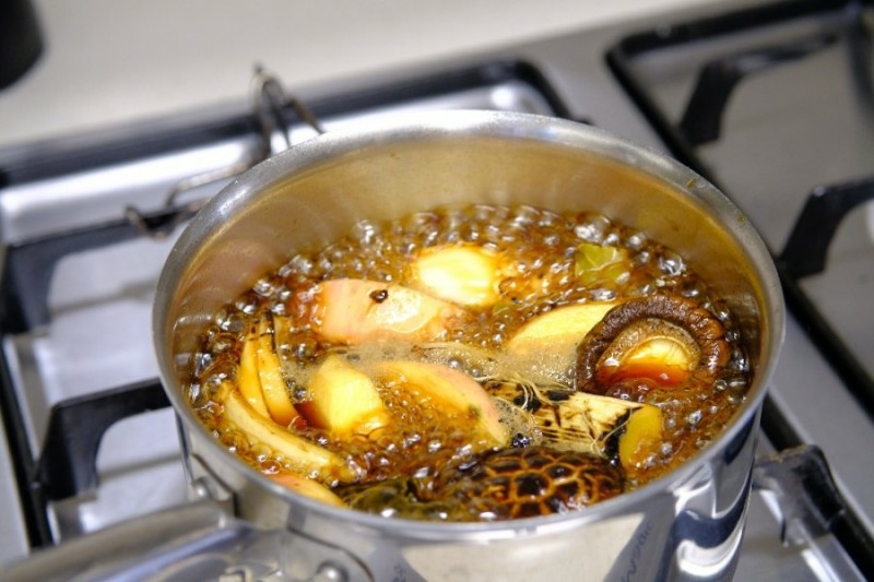 Masukkan bawang bombay dan daun bawang yang sudah dipanggang dari langkah sebelumnya ke dalam panci. Tambahkan juga bawang putih, jahe, rumput laut kering, jamur shiitake kering, daun salam, dan merica hitam utuh untuk menambah aroma. Aduk semua bahan hingga tercampur rata, lalu didihkan dengan api besar.