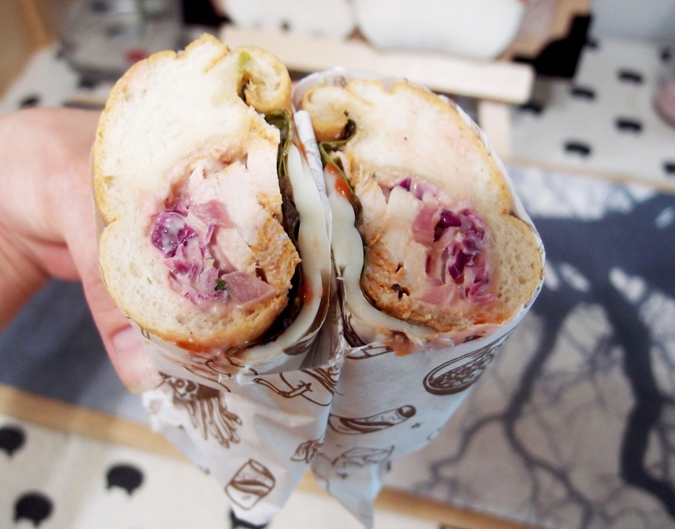 Berikut penampakan penampang sandwich yang sudah dipotong dua. Aroma unik mentega bawang putih dari baguette Banh Mi berpadu sempurna dengan isiannya. Rasa segar Salad Kubis Bawang dan gurihnya dada ayam asap menciptakan hidangan yang seimbang dan mengenyangkan. Selama Anda memiliki roti, salad kubis bawang serbaguna ini dapat dengan mudah diubah menjadi sandwich lezat kapan saja.