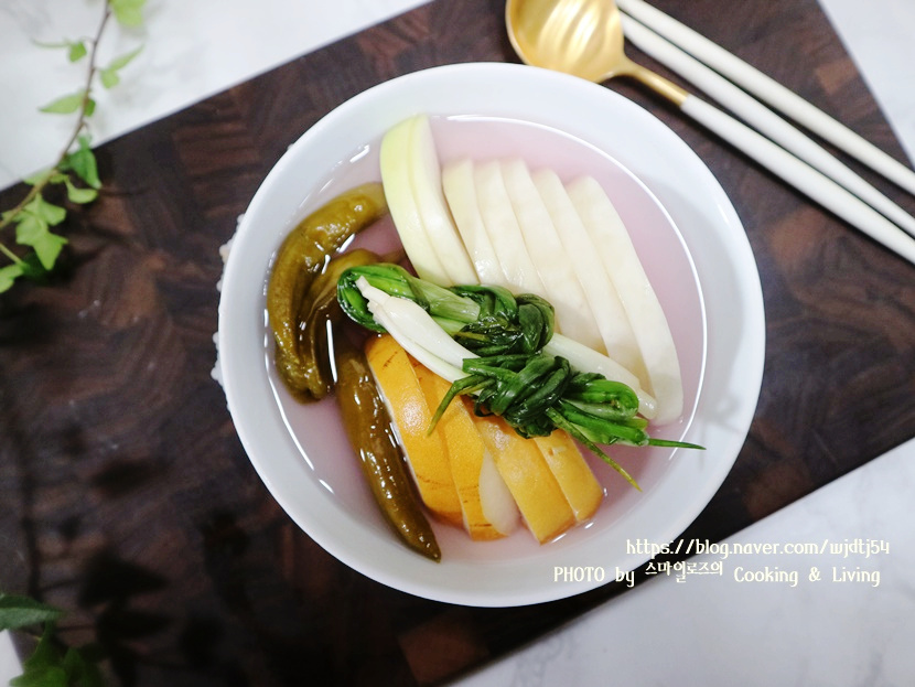 Warna merah muda halus dari bayam merah di dalam kuah terlihat sangat menggugah selera. Untuk menghindari kuah menjadi terlalu keruh, sebaiknya gunakan hanya sekitar 5 tandan bayam merah untuk warna dan rasa. Dongchimi Lobak yang dibuat dengan cermat ini pasti akan menjadi puncak musim dingin!