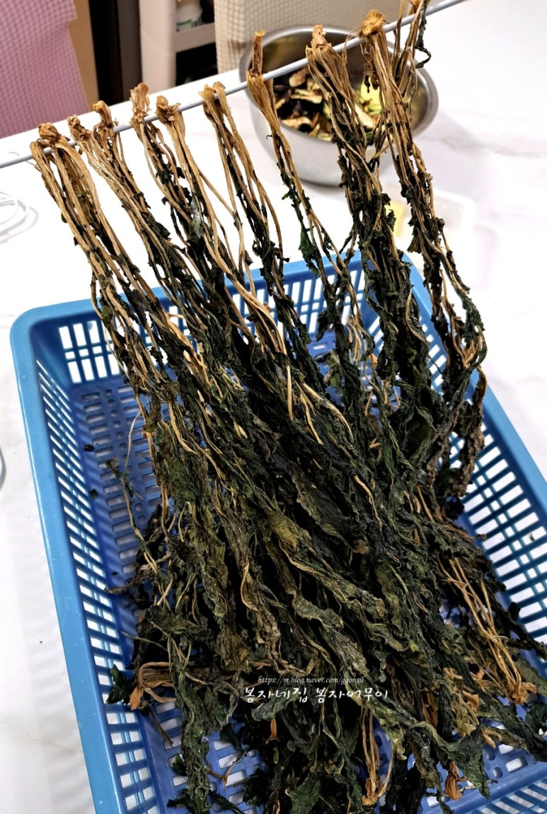 Meskipun siraegi terlihat banyak dalam berat 1kg, volumenya berkurang signifikan setelah dikeringkan dan dimasak. Kali ini, saya juga akan mengeringkan daun sawi pahit yang tersisa dari pembuatan kimchi kkakdugi. Jika terlalu banyak daun sawi pahit saat membuat kimchi, pada akhirnya hanya lobaknya yang tersisa. Dengan merobek batang tebal dan mengeringkannya, Anda dapat memanfaatkannya secara efektif tanpa membuang bubuk cabai.