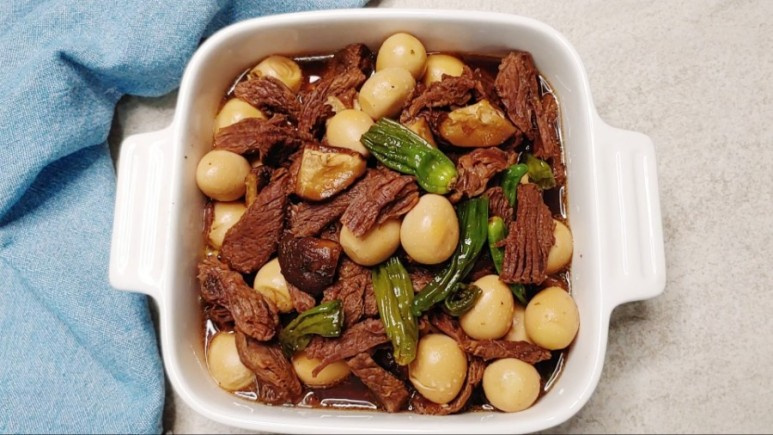 Masukkan daging sapi suwir, irisan jamur shiitake, telur puyuh rebus yang sudah dikupas, dan potongan cabai Shishito ke dalam saus bumbu. Pastikan semua bahan terendam dengan baik dalam saus.