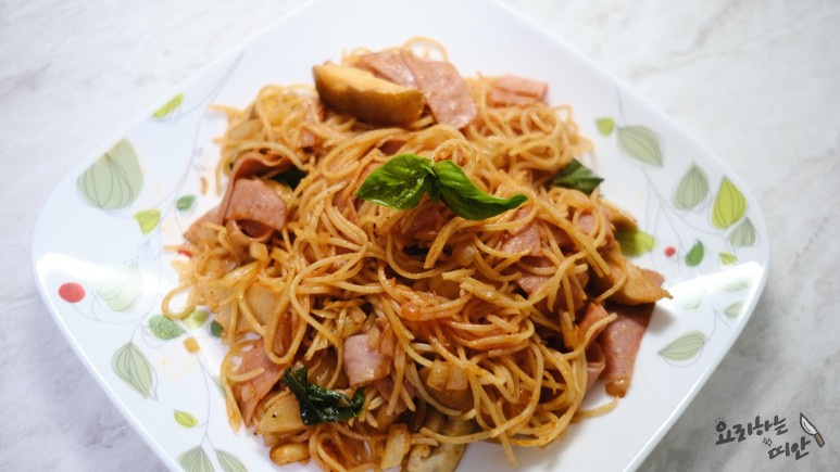 Sekarang saatnya menyatukan semuanya! Masukkan spaghetti yang sudah ditiriskan dan 3 sendok makan saus tomat ke dalam wajan. Anda bisa menyesuaikan jumlah saus tomat sesuai selera; tambahkan lebih banyak jika Anda suka lebih manis atau asam. Bumbui dengan garam dan lada. Menambahkan daun basil pada tahap ini akan memberikan aroma yang luar biasa.