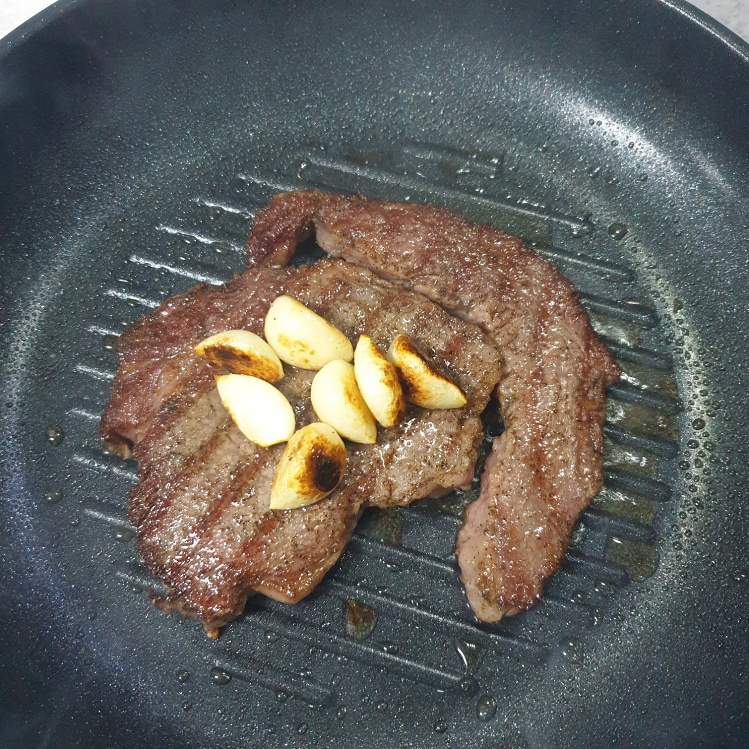 Panaskan wajan dengan api sedang-rendah dan tambahkan sedikit minyak zaitun. Masukkan bawang putih utuh ke dalam wajan dan masak hingga sedikit kecoklatan, sehingga minyaknya beraroma bawang putih. Ini akan menambah lapisan rasa pada steak Anda.