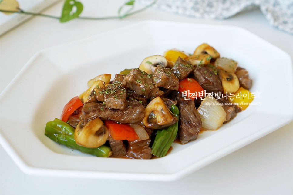 Hidangan di mana daging sapi empuk, berbagai sayuran berwarna-warni, dan jamur berpadu dalam harmoni. Warna-warnanya yang cerah menggugah selera, dan hidangan ini membuat meja makan Anda menjadi istimewa. Nikmati hidangan lezat ini!