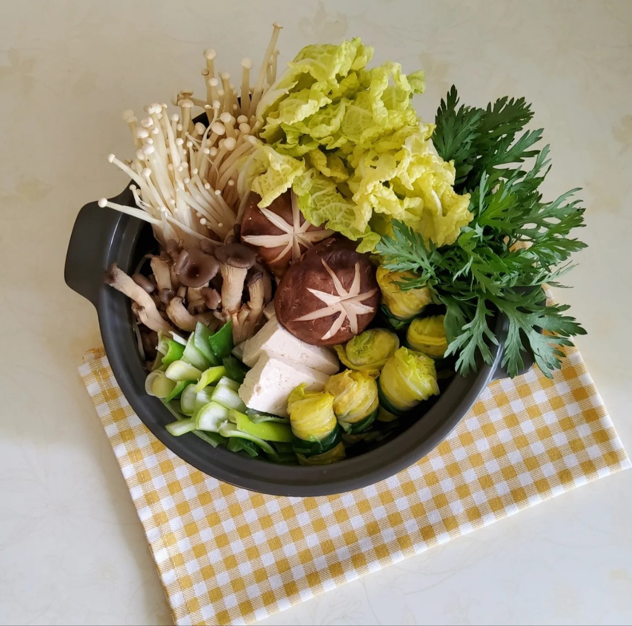 Susun dengan rapi gulungan caisim baby, shungiku, jamur enoki, jamur tiram, daun bawang, tahu yang dihancurkan, dan jamur shiitake iris ke dalam panci sup, isilah hingga padat. Mengisi bahan-bahan hingga rapat akan membuat sup terlihat lebih berlimpah dan menggugah selera saat matang.