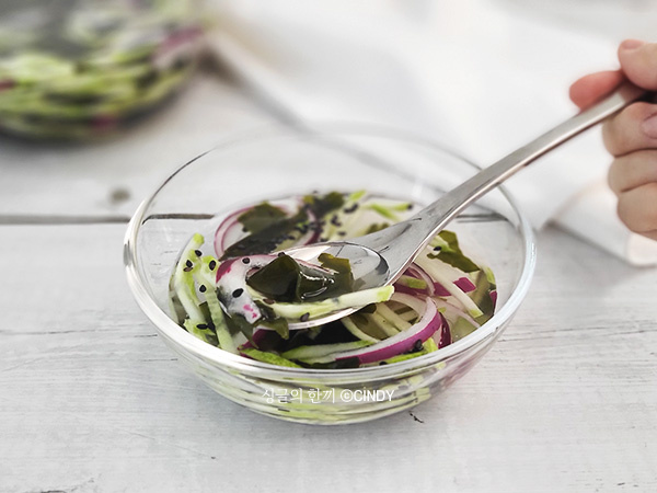 Timun ‘dadagi’, sayuran musiman di bulan Mei, dinamakan demikian karena kecenderungannya untuk menumbuhkan buah secara rapat di setiap ruasnya. Timun kaya akan kelembapan dan vitamin, menjadikannya sangat baik untuk menghilangkan dahaga selama hari-hari musim panas yang terik, dan juga membantu mengurangi pembengkakan tubuh. Nikmati hidangan timun yang lezat dan sehat ini dengan membuat Oi Miyeok Naengguk yang sederhana namun beraroma. Kuah asam manis yang menyegarkan berpadu dengan timun renyah dan rumput laut lembut pasti akan menggugah selera makan Anda. ^^