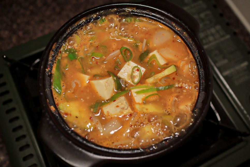 Sekarang, mari mulai memasak! Dalam panci atau pot tanah liat (ttukbaegi), campurkan 450-490ml air, irisan kentang, 2 sdm doenjang, dan 0.5 sdm ssamjang. Aduk rata untuk melarutkan pasta dalam air. Setelah mendidih, kecilkan api ke sedang dan masak hingga kentang empuk.