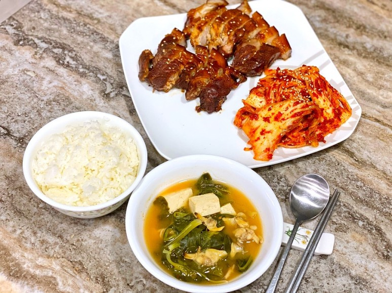 Sup doenjang bayam dan kerang ini sangat cocok dinikmati bersama bossam (daging babi rebus yang dibungkus). Direbus hingga kaya rasa, sup ini juga menjadi pilihan sarapan yang mengenyangkan dan menghangatkan. Kombinasi bayam yang kaya nutrisi dan kerang segar menghasilkan kuah yang gurih dan menenangkan.