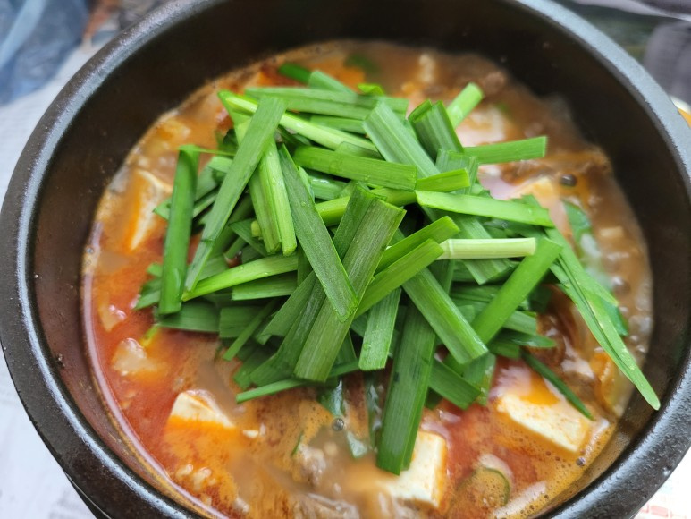 Ketika sayuran hampir matang, tambahkan 1 sendok makan bawang putih cincang, cabai Cheongyang yang dicincang, dan daun bawang yang diiris. Lanjutkan merebus perlahan selama beberapa menit lagi agar rasa tercampur. Didihkan perlahan sebelum api dikecilkan menjadi rendah.