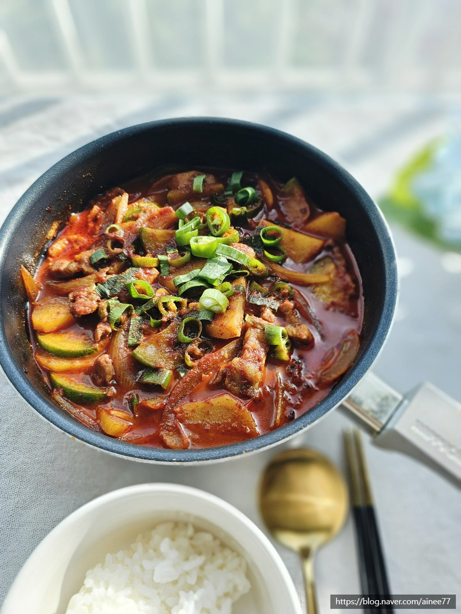 Setelah menumis bahan-bahan dengan saus, tuangkan 300 ml air dan tambahkan zukini yang sudah dipotong. Didihkan. Setelah kuah mulai bergelembung, masukkan cabai Cheongyang dan daun bawang yang sudah dicincang, lalu masak sebentar lagi. Sup Gochujang Anda yang lezat sudah siap! Sangat cocok dicampur dengan nasi atau dinikmati bersama minuman.